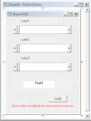Setelah mengetikan kode seperti diatas, sekarang jalankan Project anda dengan menekan tombol RUN/F5, setelah berhasil dijalankan geser ketiga ScrollBar untuk mendapatkan warna yang diinginkan dan Anda juga dapat menyalinkan kodenya untuk dieksekusi dalam pembuatan program terutama yang berhungan dengan pemograman yang berbasis grafis atau gambar.